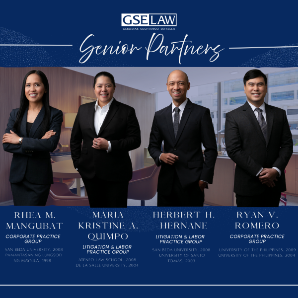 We are also pleased to announce the elevation of Rhea M. Mangubat (PLM ’98, San Beda Law ’08), Maria Kristine “KQ” A. Quimpo (DLSU ’04, Ateneo Law ’08), Herbert B. Hernane (UST ’03, San Beda Law ’08) and Ryan V. Romero (UP Diliman ’04, UP Law ’09) from Partner to Senior Partner. Both Certified Public Accountants, Rhea and Ryan are with the Corporate Practice Group and they co-head the Tax Practice Group. KQ and Bert are with the Litigation and Labor Practice Groups. KQ co-heads the Immigration Practice Group, while Bert co-heads the Litigation Practice Group.